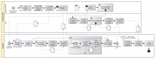 In the following I will go though the steps of such a exercise-submission flow. These steps are visualized in the Business Process Modelling Notation (BPMN) diagrams, one with a file server as a share point and one with git.